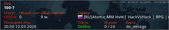 Играет на Counter Strike Global Offensive сервере. Страна: РоссияПервый раз замечен 20:39 12.03.2026
