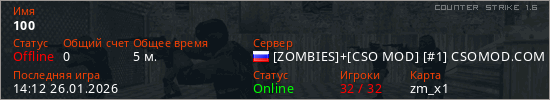 Играет на Counter Strike 1.6 сервере. Страна: РоссияПервый раз замечен 14:09 26.01.2026