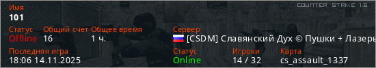Играет на Counter Strike 1.6 сервере. Страна: РоссияПервый раз замечен 22:19 25.03.2024