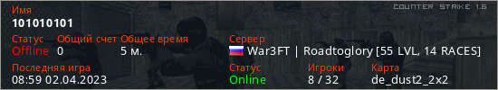 Играет на Counter Strike 1.6 сервере. Страна: РоссияПервый раз замечен 08:55 02.04.2023