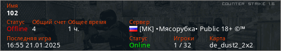 Играет на Counter Strike 1.6 сервере. Страна: РоссияПервый раз замечен 20:06 06.05.2023