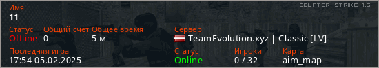 Играет на Counter Strike 1.6 сервере. Страна: ЛатвияПервый раз замечен 17:52 05.02.2025