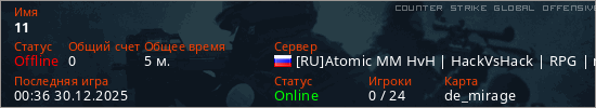 Играет на Counter Strike Global Offensive сервере. Страна: РоссияПервый раз замечен 00:32 30.12.2025
