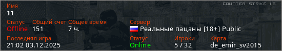 Играет на Counter Strike 1.6 сервере. Страна: РоссияПервый раз замечен 10:35 23.01.2023