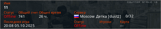 Играет на Counter Strike 1.6 сервере. Страна: РоссияПервый раз замечен 14:48 14.08.2020