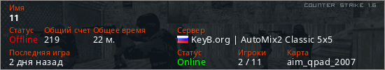 Играет на Counter Strike 1.6 сервере. Страна: РоссияПервый раз замечен 22:29 18.04.2026