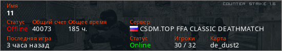 Играет на Counter Strike 1.6 сервере. Страна: РоссияПервый раз замечен 19:05 10.12.2019