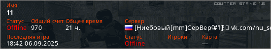 Последний раз был в сети 18:42 06.09.2025 Игрок с таким ником замечен на 59 серверах