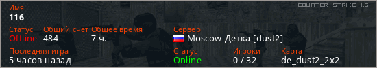 Играет на Counter Strike 1.6 сервере. Страна: РоссияПервый раз замечен 17:40 21.08.2020