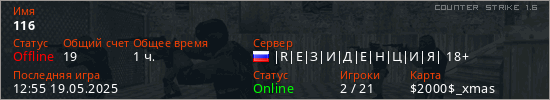 Последний раз был в сети 12:55 19.05.2025 Игрок с таким ником замечен на 26 серверах