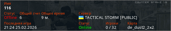 Играет на Counter Strike 1.6 сервере. Страна: УкраинаПервый раз замечен 20:59 25.02.2026
