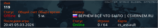 Играет на Counter Strike Global Offensive сервере. Страна: РоссияПервый раз замечен 20:35 05.03.2026