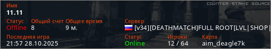 Играет на Counter Strike Source сервере. Страна: РоссияПервый раз замечен 21:46 27.10.2025