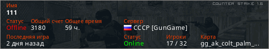Играет на Counter Strike 1.6 сервере. Страна: РоссияПервый раз замечен 17:18 10.05.2023
