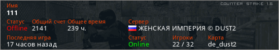Играет на Counter Strike 1.6 сервере. Страна: РоссияПервый раз замечен 12:40 08.10.2021
