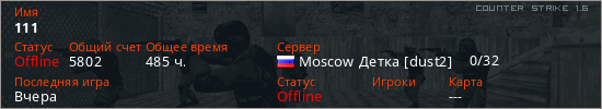 Играет на Counter Strike 1.6 сервере. Страна: РоссияПервый раз замечен 03:34 03.08.2020
