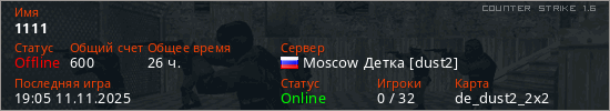 Играет на Counter Strike 1.6 сервере. Страна: РоссияПервый раз замечен 17:50 31.07.2020