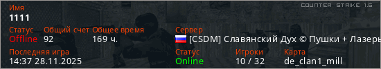 Играет на Counter Strike 1.6 сервере. Страна: РоссияПервый раз замечен 10:08 02.04.2024