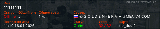 Играет на Counter Strike 1.6 сервере. Страна: РоссияПервый раз замечен 14:40 05.03.2023