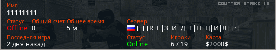 Играет на Counter Strike 1.6 сервере. Страна: РоссияПервый раз замечен 18:56 17.03.2026
