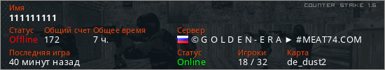 Играет на Counter Strike 1.6 сервере. Страна: РоссияПервый раз замечен 04:15 15.03.2023