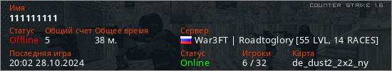 Играет на Counter Strike 1.6 сервере. Страна: РоссияПервый раз замечен 20:26 06.01.2024