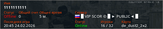 Играет на Counter Strike 1.6 сервере. Страна: РоссияПервый раз замечен 20:43 24.02.2026