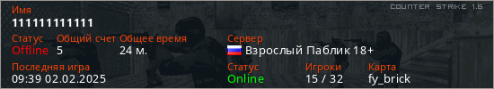 Играет на Counter Strike 1.6 сервере. Страна: РоссияПервый раз замечен 14:27 12.08.2021