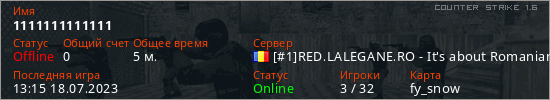 Играет на Counter Strike 1.6 сервере. Страна: РумынияПервый раз замечен 13:05 18.07.2023