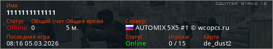 Играет на Counter Strike 1.6 сервере. Страна: РоссияПервый раз замечен 08:14 05.03.2026