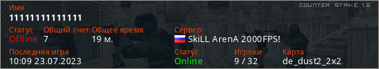 Играет на Counter Strike 1.6 сервере. Страна: РоссияПервый раз замечен 15:53 01.08.2022