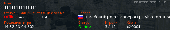Играет на Counter Strike 1.6 сервере. Страна: РоссияПервый раз замечен 11:32 15.04.2022