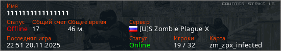 Играет на Counter Strike 1.6 сервере. Страна: РоссияПервый раз замечен 16:03 04.11.2021