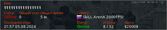 Играет на Counter Strike 1.6 сервере. Страна: РоссияПервый раз замечен 21:54 05.08.2024