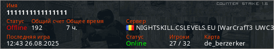 Последний раз был в сети 12:43 26.08.2025 Игрок с таким ником замечен на 23 серверах
