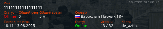 Играет на Counter Strike 1.6 сервере. Страна: РоссияПервый раз замечен 18:03 13.08.2025
