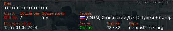 Играет на Counter Strike 1.6 сервере. Страна: РоссияПервый раз замечен 12:51 01.06.2024