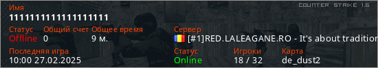 Играет на Counter Strike 1.6 сервере. Страна: РумынияПервый раз замечен 00:44 15.12.2024