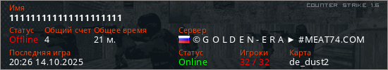 Последний раз был в сети 20:26 14.10.2025 Игрок с таким ником замечен на 12 серверах