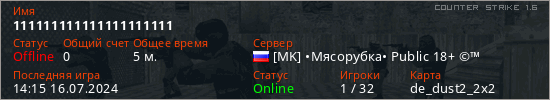 Играет на Counter Strike 1.6 сервере. Страна: РоссияПервый раз замечен 14:10 16.07.2024