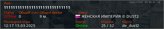 Играет на Counter Strike 1.6 сервере. Страна: РоссияПервый раз замечен 18:57 01.11.2023