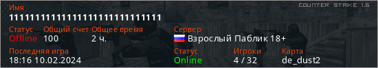 Играет на Counter Strike 1.6 сервере. Страна: РоссияПервый раз замечен 23:18 25.10.2019