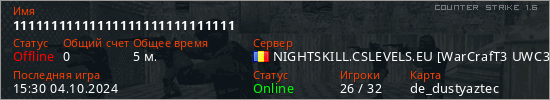 Последний раз был в сети 15:30 04.10.2024 Игрок с таким ником замечен на 13 серверах