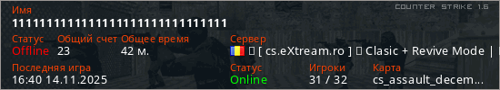 Последний раз был в сети 16:40 14.11.2025 Игрок с таким ником замечен на 31 сервере