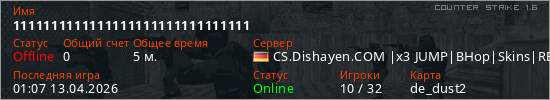 Играет на Counter Strike 1.6 сервере. Страна: ГерманияПервый раз замечен 22:36 12.04.2026