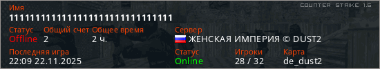 Последний раз был в сети 22:09 22.11.2025 Игрок с таким ником замечен на 31 сервере