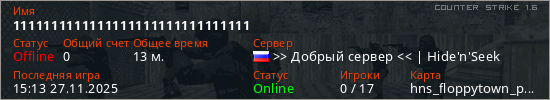 Последний раз был в сети 15:13 27.11.2025 Игрок с таким ником замечен на 31 сервере