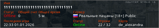 Играет на Counter Strike 1.6 сервере. Страна: РоссияПервый раз замечен 22:30 01.01.2026