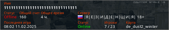Последний раз был в сети 08:02 11.02.2025 Игрок с таким ником замечен на 31 сервере