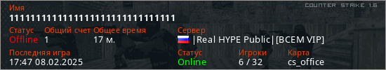 Играет на Counter Strike 1.6 сервере. Страна: РоссияПервый раз замечен 15:16 11.01.2024